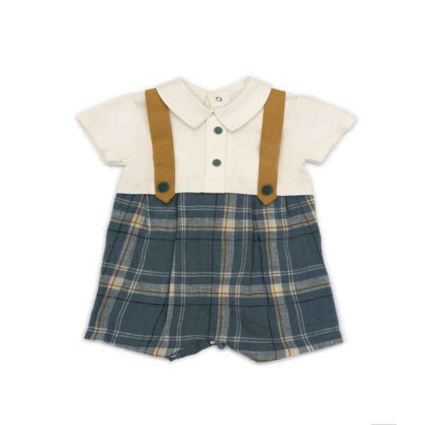 Pagliaccetto da neonato Barcellino. Il modello, con finta salopette, presenta apertura sul retro e fra le gambe con bottoni a pressione per agevolare il cambio. Il pagliaccetto è realizzato in jersey elasticizzato bianco latte con colletto a punta e fantasia lino a quadri avion nella parte inferiore. Bottoncini decorativi sulle bretelle e sul davanti. #Target Infant