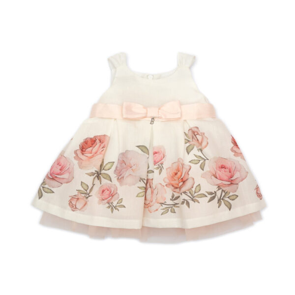 Abito realizzato con raffinati tessuti di organza e tulle foderati internamente in cotone per offrire una confortevole vestibilità Barcellino. Corpetto smanicato e apertura posteriore con zip invisibile. Voluminosa gonna multistrato con una stampa a fiori all-over ed arricchita da una fusciacca rosa con fiocco applicato. Abito perfetto per le occasioni speciali. #Target Infant