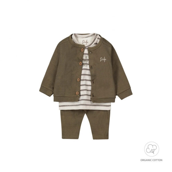 Questo simpatico completo da neonato di Dirkje è composto da una T-shirt, un pantalone e un cardigan. La maglietta bianca a maniche corte presenta una stampa a righe blu scuro, verde e marrone e un testo sul davanti. La maglietta si chiude con bottoni a pressione sulla spalla. I pantaloncini sono verdi con bottoni sul davanti e una bella trama nel tessuto. Il cardigan abbinato è verde e ha una bella trama nel tessuto. Si chiude con bottoni sul davanti. Realizzati in cotone da agricoltura biologica, questi capi sono morbidi, confortevoli e sicuri per la pelle sensibile dei bambini. Inoltre, contribuiscono a un pianeta più sano grazie a pratiche di coltivazione sostenibili ed ecologiche. Scegliete il cotone biologico per coccolare il vostro bambino e proteggere il mondo. #Target Infant